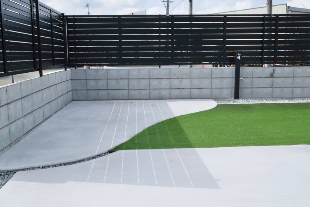 芝生も取り入れ、あえて角を丸めることで、冷たくなりがちな素材に温かみを与えました。