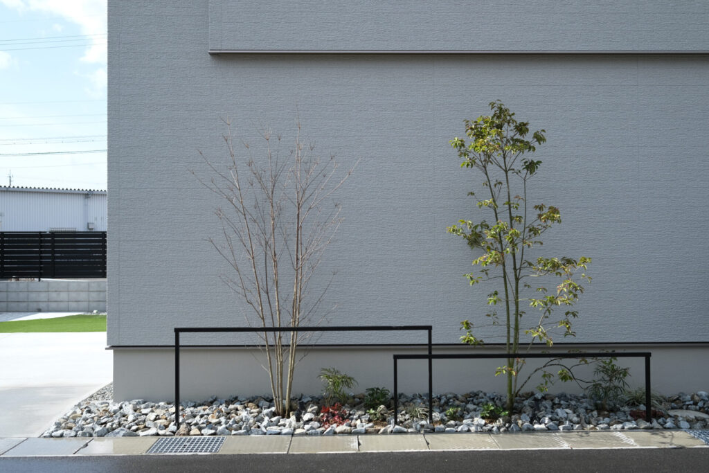 その傍らで揺れる常緑樹の緑は、落ち葉が少なく管理が楽なため、忙しい日々の中でも常に美しい状態を保てます。