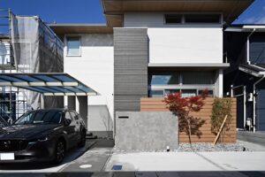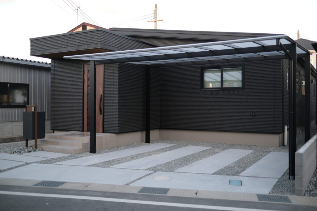 土間コンクリートに刻まれたシャープなスリットデザイン。 シンプルな素材使いでも、スリットのデザインひとつで空間に動きが生まれます。カーポートの「抜け感」と、アプローチの「ライン」が相まって、モダンな佇まいに仕上がりました。