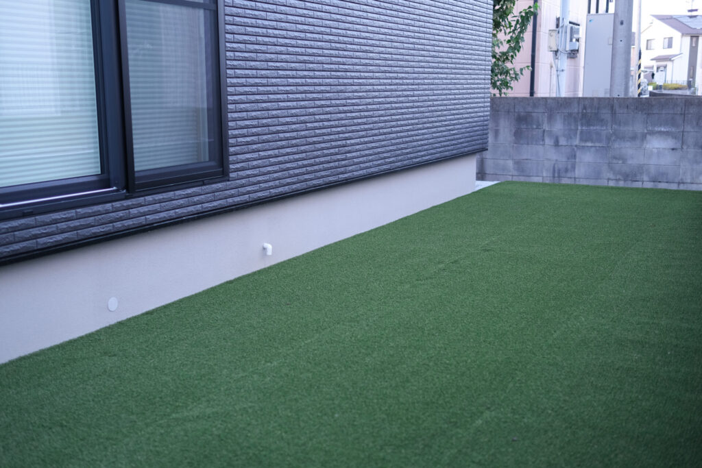 建物の裏手には、一面に高品質な人工芝を施工しました。 天然芝のような自然な風合いを楽しみながら、面倒な草むしりや芝刈りからは解放されます。ダークトーンの建物と、鮮やかな人工芝のコントラストが美しく、お子様やペットも安心して遊べる清潔で機能的なお庭です。
