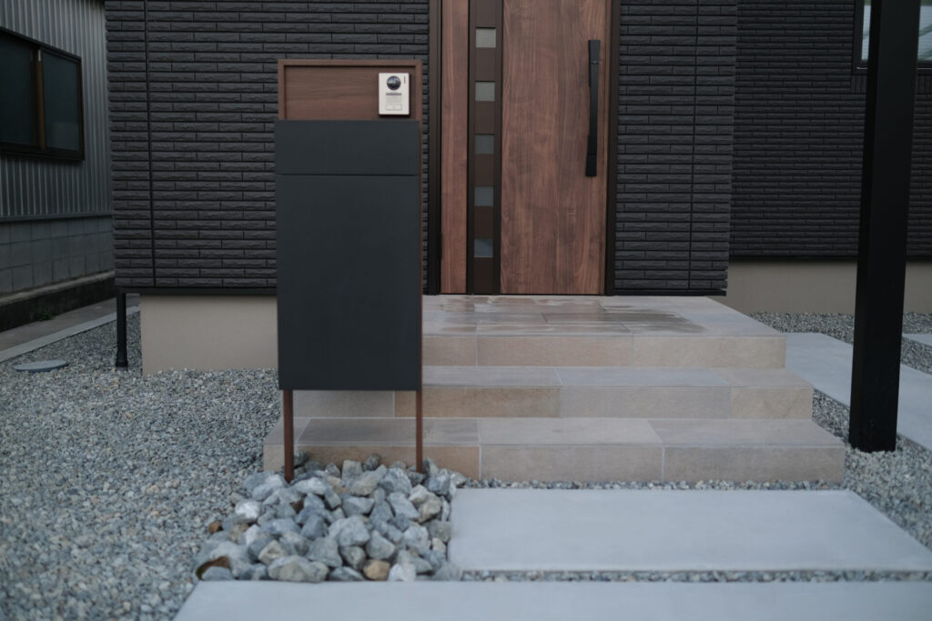 玄関ドアの美しい木目と調和するよう、機能門柱も同系色のウッドカラーをチョイス。 あえて装飾を削ぎ落としたシンプルな組み合わせが、洗練された印象を与えます。足元にはコンクリートの質感を活かしたアプローチを。無機質な素材の中に、木目の温かみが際立つ計算された統一感が魅力です。