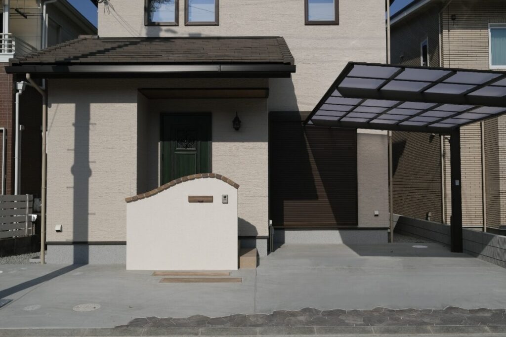 建物と外構の色味をリンクさせることで、大きな構造物であるカーポートが空間に溶け込み、美しい統一感を生み出しています。
