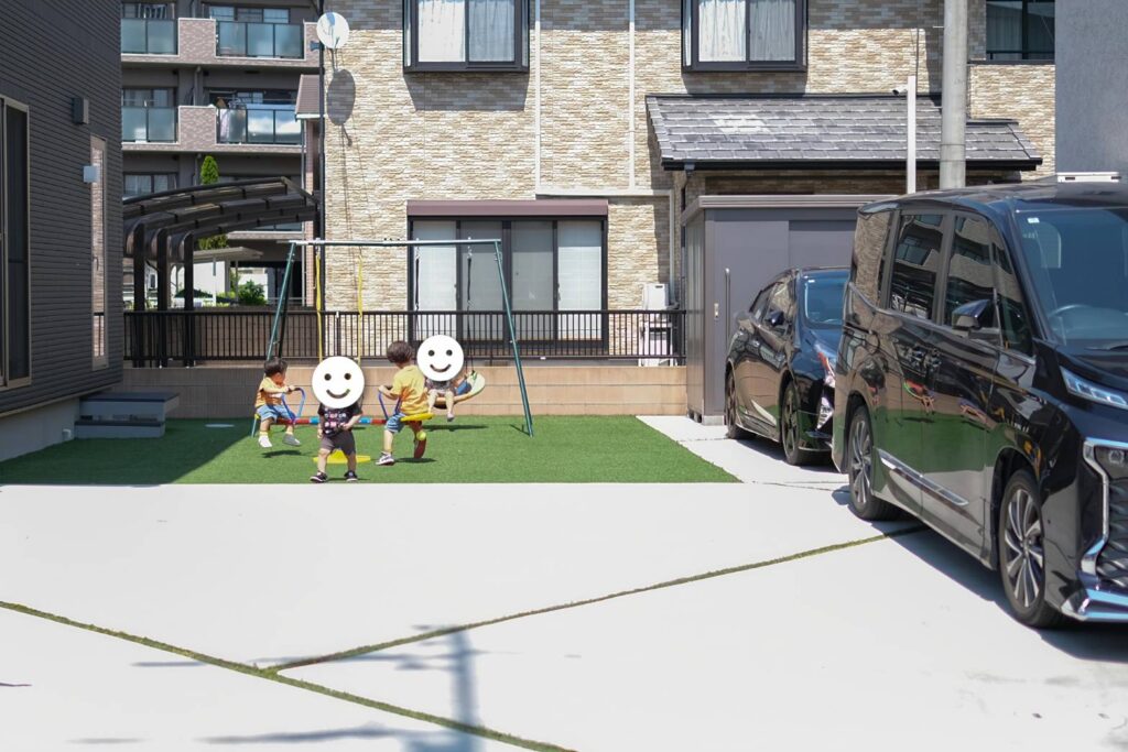 お庭スペースに人工芝を敷設することで、メンテナンスの手間を減らしつつ、一年中緑が楽しめる快適な空間を実現しました。この広々としたスペースは、ブランコや滑り台などの遊具を設置してもなお余裕があり、お子様たちが思い切り走り回って遊べる、安全で開放的な環境となっています。