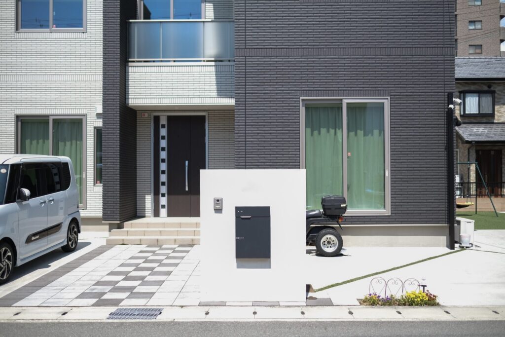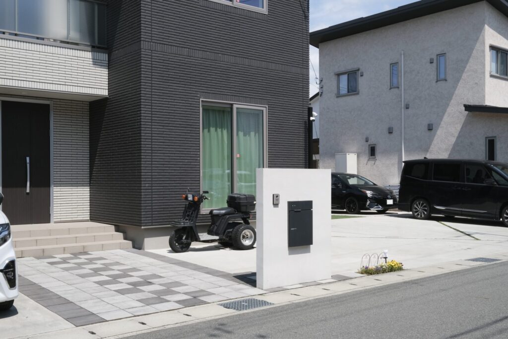 門柱はホワイトの塗り壁仕上げとしたことで、建物の色とのコントラストが映え、全体が垢抜けた印象になっています。宅配ボックスを埋め込んで不在時でも荷物を受け取れるよう、実用的な工夫も施されています。