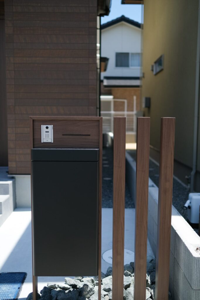 玄関周りにはシックな宅配ボックス付き機能門柱と角柱を設置し、住まいの印象を格上げしています。