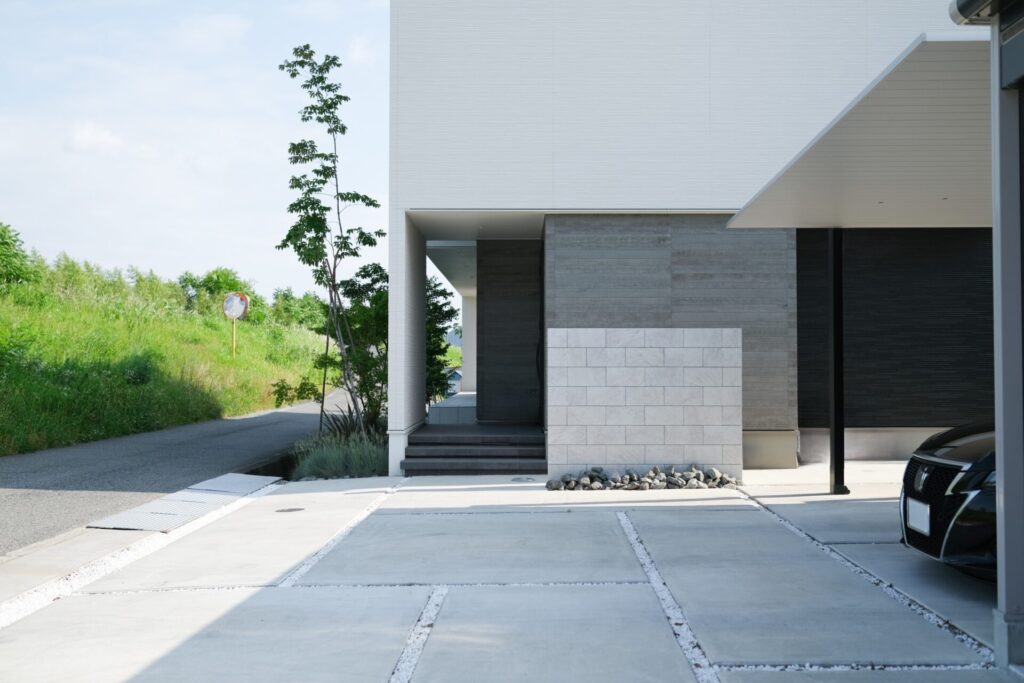 コンクリートの駐車場は直線のラインが美しく、外構全体に統一感を出しています。