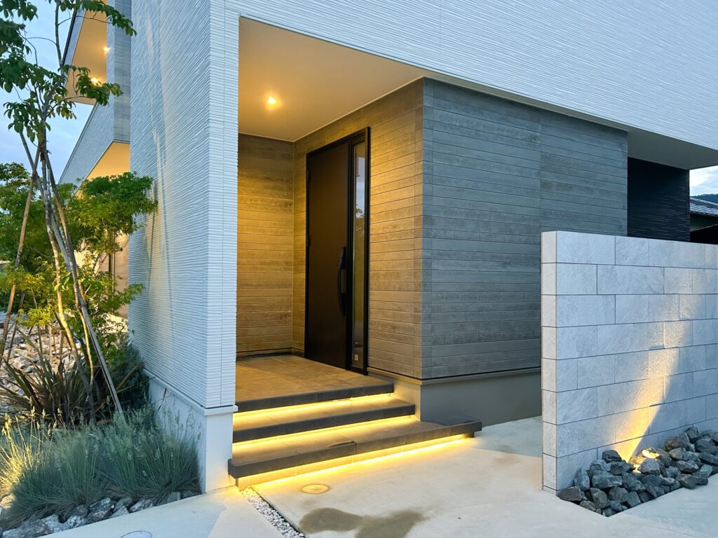 玄関・アプローチのアクセントとして、照明とフロート階段が建物の美しさを引き立て、訪れる人に洗練された印象を与えます。